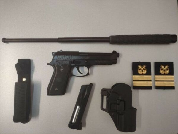 Εντός του σκάφους στο οποίο διέμενε, βρέθηκε μία πλαστική θήκη μέσης πιστολιού, ενώ διαπιστώθηκε ότι φορούσε μέσα από το σακάκι του, λευκό πουκάμισο με επωμίδες, στις οποίες έφερε τον βαθμό του Ανθυποπλοιάρχου Λιμενικού Σώματος.
