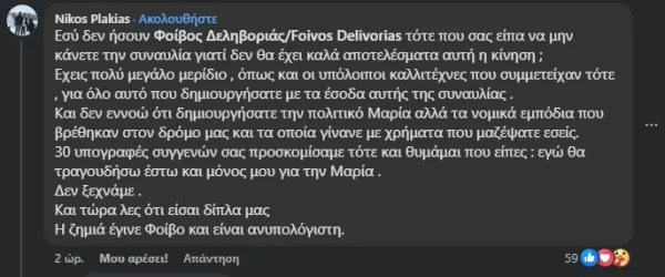 Ακολούθησαν εκατοντάδες σχόλια κάτω από την ανάρτησή του Φοίβου Δεληβοριά μεταξύ των οποίων και του Νίκου Πλακιά ο οποίος έγραψε: «Εσύ δεν ήσουν Φοίβος Δεληβοριάς/Foivos Delivorias τότε που σας είπα να μην κάνετε την συναυλία γιατί δεν θα έχει καλά αποτελέσματα αυτή η κίνηση ;