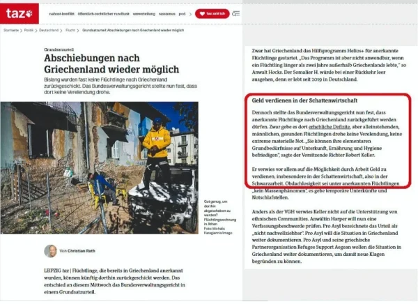 Υπό τον τίτλο «Κερδίζοντας χρήματα στην παραοικονομία», η εφημερίδα τονίζει ότι το δικαστήριο αποφάσισε πως οι αναγνωρισμένοι πρόσφυγες μπορούν τώρα να επιστραφούν στην Ελλάδα, όχι μόνο διότι «μπορούν να ικανοποιήσουν τις βασικές τους ανάγκες για στέγαση, τροφή και υγιεινή». Απορρίπτοντας τις αιτιάσεις των συνηγόρων των δύο αιτούντων που ήθελαν να παραμείνουν στη Γερμανία, ο προεδρεύων δικαστής Robert Keller «αναφέρθηκε ιδιαίτερα (και) στη δυνατότητα να κερδίζουν χρήματα μέσω της εργασίας, ιδίως στην παραοικονομία, δηλαδή στην παράνομη απασχόληση». Απίστευτο κι όμως πραγματικό!