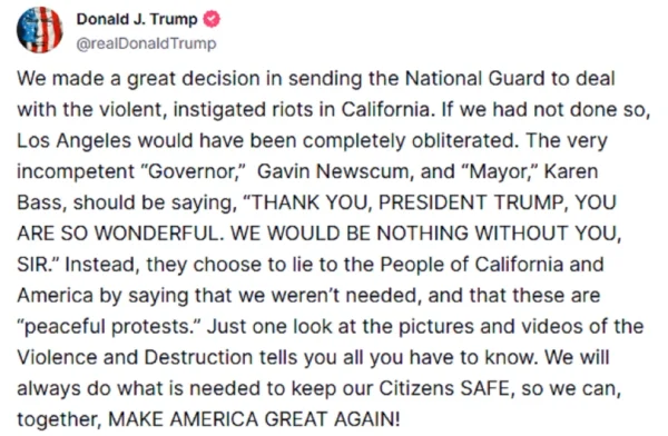 «Λάβαμε μια σπουδαία απόφαση στέλνοντας την Εθνική Φρουρά να αντιμετωπίσει τις βίαιες, υποκινούμενες ταραχές στην Καλιφόρνια. Αν δεν το είχαμε κάνει, το Λος Άντζελες θα είχε καταστραφεί ολοσχερώς. Ο πολύ ανίκανος “Κυβερνήτης”, Γκάβιν Νιούσκουμ, και η “Δήμαρχος”, Κάρεν Μπας, θα έπρεπε να λένε: “ΣΑΣ ΕΥΧΑΡΙΣΤΟΥΜΕ, ΠΡΟΕΔΡΕ ΤΡΑΜΠ, ΕΙΣΤΕ ΤΟΣΟ ΥΠΕΡΟΧΟΣ. ΔΕΝ ΘΑ ΉΜΑΣΤΑΝ ΤΊΠΟΤΑ ΧΩΡΊΣ ΕΣΆΣ, ΚΎΡΙΕ”. Αντ’ αυτού, επιλέγουν να λένε ψέματα στον λαό της Καλιφόρνιας και της Αμερικής λέγοντας ότι δεν μας χρειάζονταν και ότι πρόκειται για “ειρηνικές διαμαρτυρίες”. Μια ματιά στις εικόνες και τα βίντεο της βίας και της καταστροφής σας λέει όλα όσα πρέπει να ξέρετε. Θα κάνουμε πάντα ό,τι χρειάζεται για να κρατήσουμε τους Πολίτες μας ΑΣΦΑΛΕΙΣ, ώστε να μπορέσουμε, μαζί, να ΚΑΝΟΥΜΕ ΤΗΝ ΑΜΕΡΙΚΗ ΜΕΓΑΛΗ ΞΑΝΑ!».