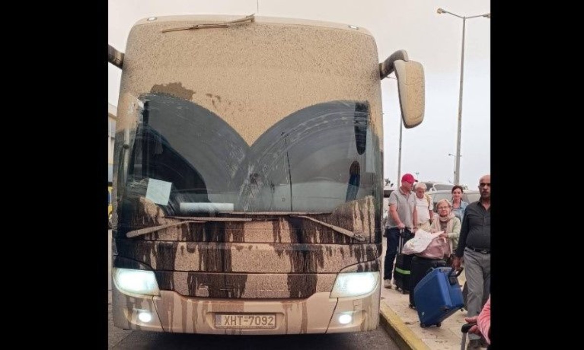 Εντυπωσιακές και ταυτόχρονα ανησυχητικές εικόνες κατέγραψαν τα social media από το αεροδρόμιο Ηρακλείου, όπου λεωφορείο γεμάτο τουρίστες έφτασε κυριολεκτικά καλυμμένο από αφρικανική σκόνη.
