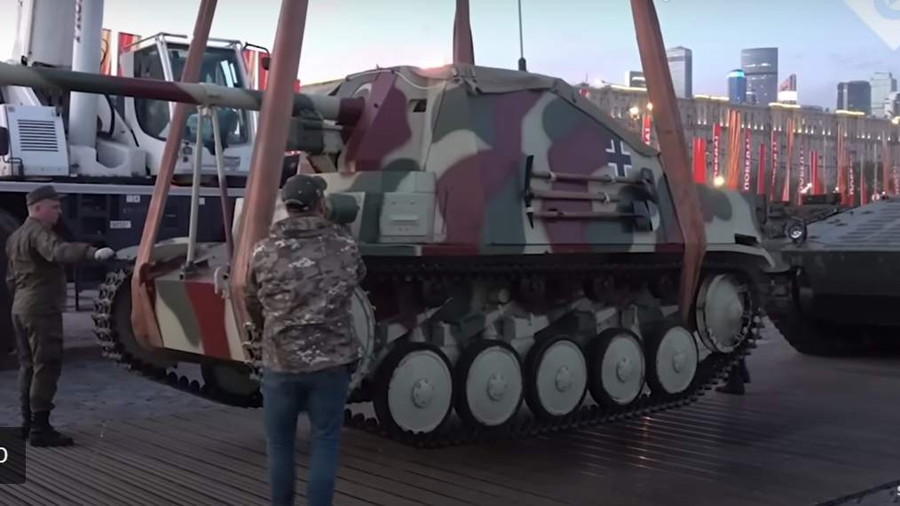 Μια πινακίδα γράφει «Η ιστορία επαναλαμβάνεται» και πρόκειται για αναφορά στην ήττα της ναζιστικής Γερμανίας από τις δυνάμεις του Κόκκινου Στρατού της Σοβιετικής Ένωσης.