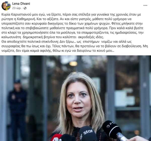 Σε ανάρτησή της στο Facebook, η Λένα Διβάνη διερωτάται ανοιχτά αν η Μαρία Καρυστιανού ενδέχεται να εξελιχθεί σε πολιτικά επικίνδυνη φιγούρα, σημειώνοντας ότι πριν ακόμη κάνει τα πρώτα της σταθερά βήματα στην πολιτική, έχει ήδη επιστρατεύσει «μισόλογα, επαμφοτερίζουσες διατυπώσεις και ημιδιαψεύσεις», οι οποίες –κατά την ίδια– λειτουργούν ως ένα «καλοσυνάτο δημοκρατικό περιτύλιγμα που συγκαλύπτει ακροδεξιές αντιλήψεις».