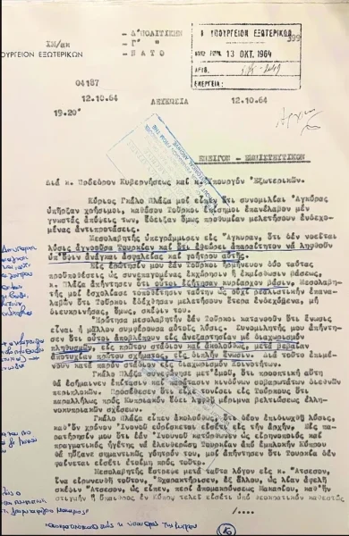 Παράλληλα, ιδιαίτερο ενδιαφέρον παρουσιάζουν και παλαιότερα αρχεία, όπως εκείνα της περιόδου 1955-1960, όταν διαμορφώθηκαν οι βάσεις του Κυπριακού ζητήματος. Εκεί καταγράφονται κομβικές εξελίξεις, όπως η δράση της ΕΟΚΑ και οι διεθνείς διαπραγματεύσεις που οδήγησαν στις συμφωνίες Ζυρίχης και Λονδίνου.