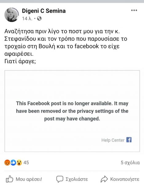 Συγκεκριμένα, όπως αποκάλυψε στην προσωπική της σελίδα στο facebook, αναζήτησε το ποστ που είχε κάνει για τη «Σκατιάνα» την οποία μάλιστα είχε χαρακτηρίσει «πλύστρα» και διαπίστωσε πως έχει εξαφανιστεί! Αναρωτήθηκε μάλιστα με νόημα: «Γιατί άραγε;».