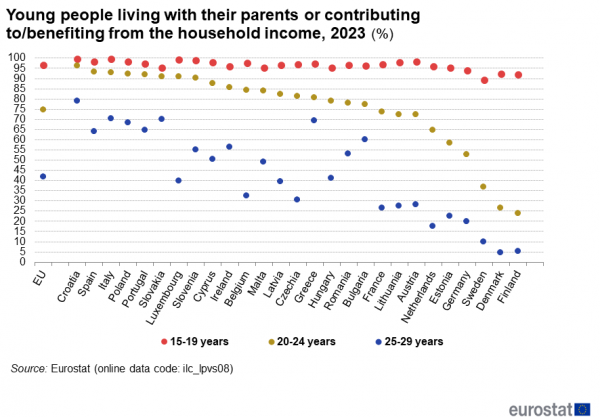 Στην Κροατία, την Ισπανία, την Ιταλία, την Πολωνία, την Πορτογαλία, τη Σλοβακία και την Ελλάδα, οι περισσότεροι νέοι ζουν με τους γονείς τους ή συμβάλλουν στο εισόδημα του νοικοκυριού ή επωφελούνται από αυτό.