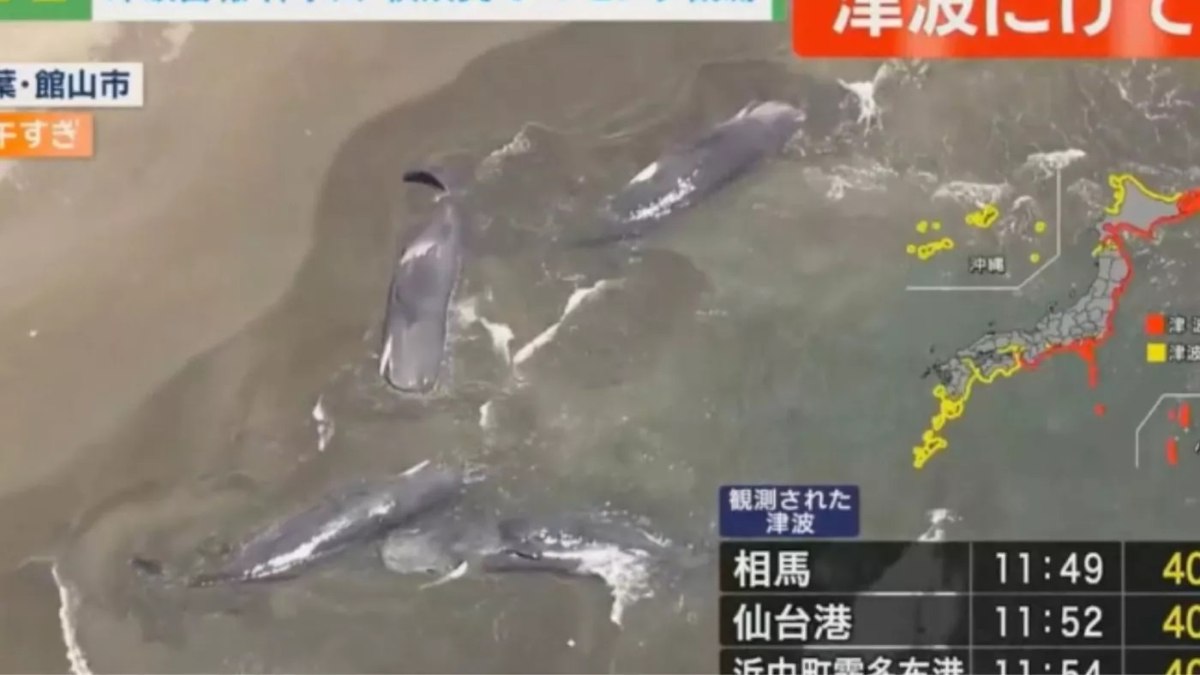 Βίντεο που ήρθε στη δημοσιότητα δείχνει φάλαινες που ξεβράστηκαν στην πόλη Τατεγιάμα, στην Τσίμπα της Ιαπωνίας μετά τον ισχυρό σεισμό στη Ρωσία.