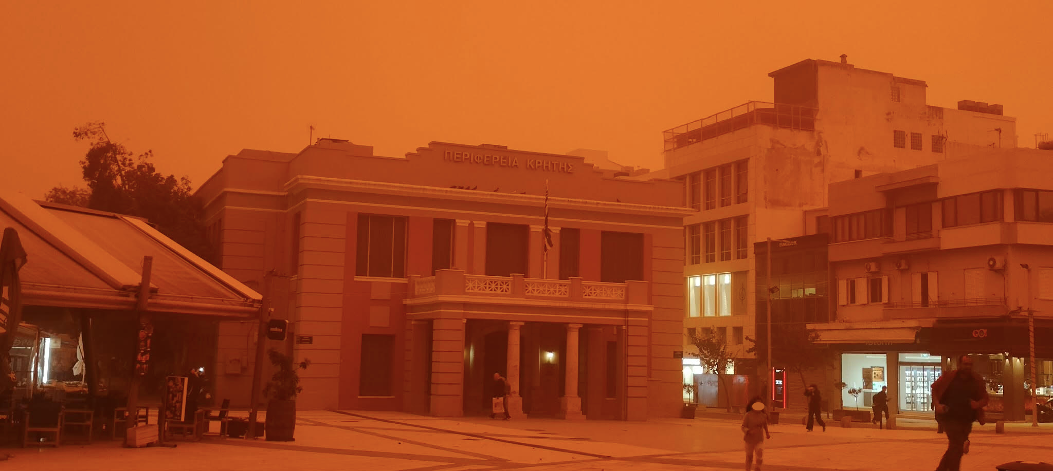 Σχεδόν απόκοσμες ήταν οι εικόνες από την Κρήτη των τελευταίων δύο ημερών λόγω της αφρικανικής σκόνης που σκέπασε κυριολεκτικά το νησί και δίνοντας στον ουρανό ένα έντονο πορτοκαλί χρώμα… βγαλμένο από ταινίες τρόμου.