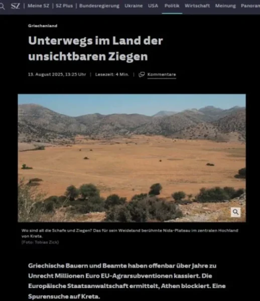 Η γερμανική εφημερίδα Süddeutsche Zeitung έκανε οδοιπορικό στην Κρήτη (έχοντας τίτλο: «Οδοιπορικό στη χώρα των αόρατων κατσικιών») για να εξηγήσει το σκάνδαλο των αγροτικών επιδοτήσεων του ΟΠΕΚΕΠΕ, που προκάλεσε την παρέμβαση της Ευρωπαϊκής Εισαγγελίας.