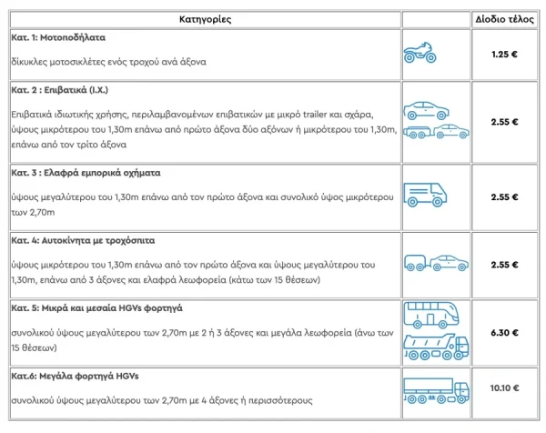 Κατηγορία 5 – Μικρά και μεσαία φορτηγά, καθώς και μεγάλα λεωφορεία: 6,30 €