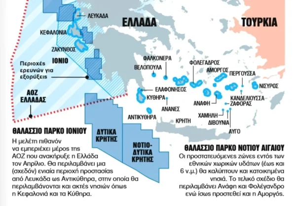 Το θαλάσσιο πάρκο στο Ιόνιο θα είναι ενιαίο από τη Λευκάδα έως τα Αντικύθηρα, ενώ το αντίστοιχο του Αιγαίου θα είναι κατακερματισμένο και θα περιορίζεται αυστηρά εντός των χωρικών υδάτων.