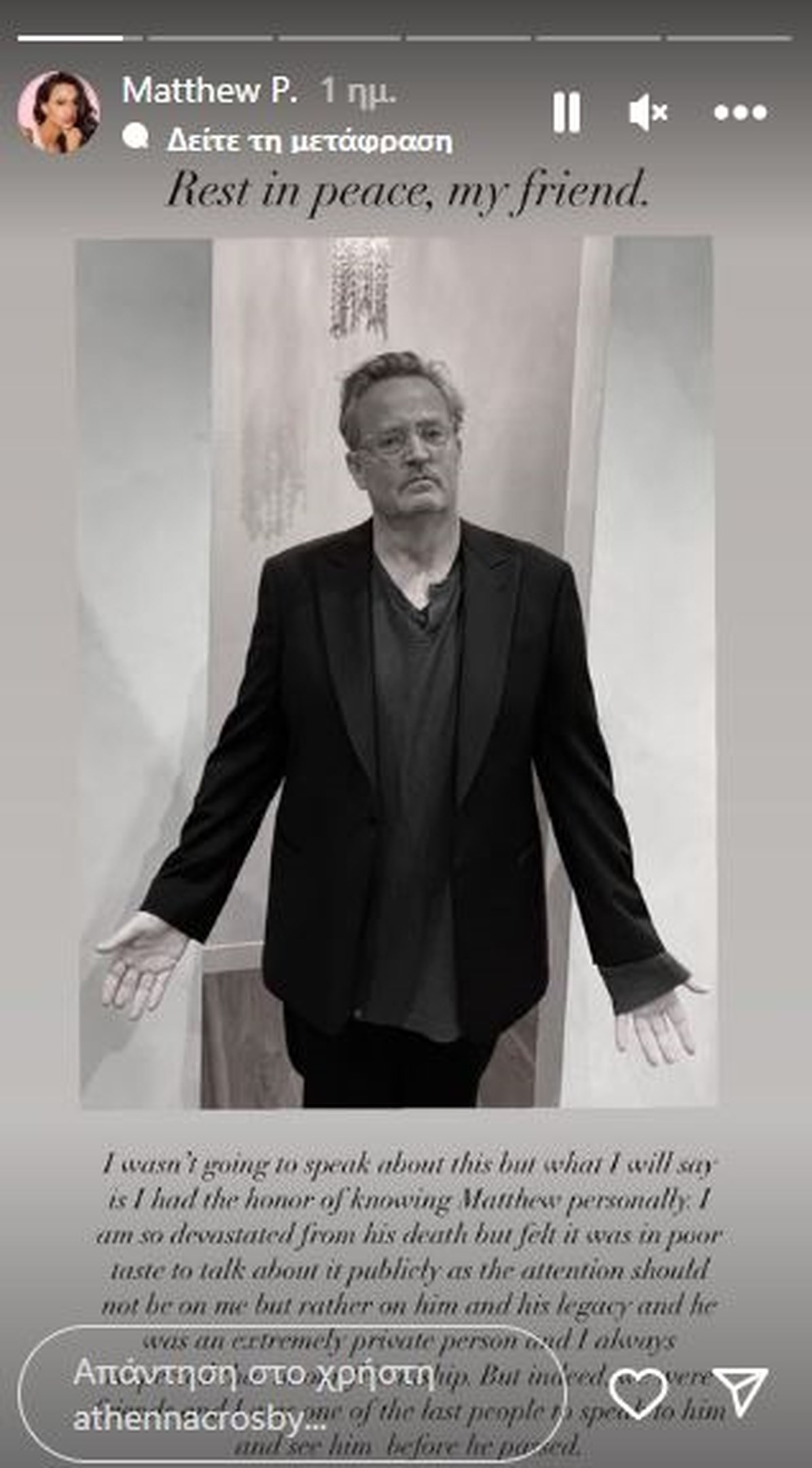 Και συμπλήρωσε: “Δεν σκόπευα να μιλήσω αλλά αυτό που έχω να πω είναι ότι είχα την τιμή να γνωρίσω προσωπικά τον Μάθιου Πέρι. Είμαι συντετριμμένη από τον θάνατό του αλλά αισθάνηθηκα ότι ήταν άκομψο να μιλήσω δημόσια τώρα καθώς η προσοχή δεν πρέπει να στραφεί σε εμένα αλλά στον ίδιο και την κληρονομιά του”.