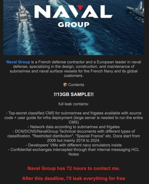 Ο ευρωπαϊκός αμυντικός Naval Group επιβεβαίωσε ότι διερευνά κυβερνοεπίθεση, την μεγαλύτερη στην Γαλλία. Ευαίσθητα εσωτερικά δεδομένα δημοσιεύτηκαν στο Διαδίκτυο από χάκερ. Το γεγονός εγείρει μείζον θέμα ασφαλείας τόσο για τα μαχητικά Rafale που έχει προμηθευτεί η Ελλάδα όσο και για τις φρεγάτες Belh@rra.