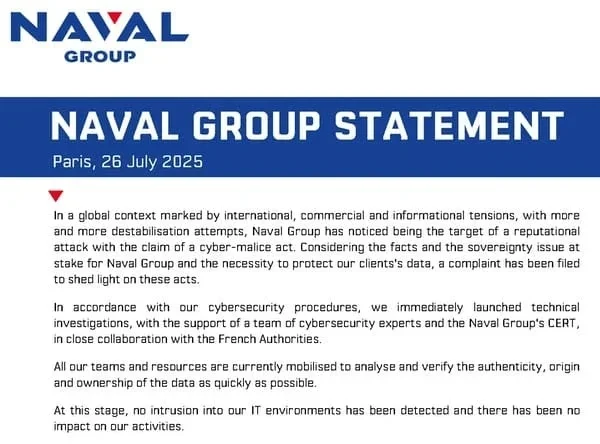 «Σε αυτό το στάδιο, δεν έχει εντοπιστεί καμία εισβολή στα περιβάλλοντα πληροφορικής μας και δεν έχει υπάρξει καμία επίπτωση στις δραστηριότητές μας» κατέληξε η συμβουλευτική επιτροπή της Naval Group.