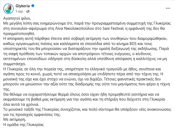 Μπροστά σε αυτή την κατάσταση, η Γλυκερία επέλεξε να αποχωρήσει, τονίζοντας ότι η μουσική της έχει ως στόχο να ενώνει και όχι να διχάζει. Η επίσημη δήλωση παρατίθεται αυτούσια, εξηγώντας τους λόγους αυτής της δύσκολης απόφασης.