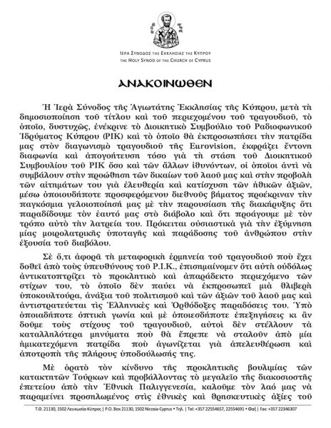 Η Ιερά Σύνοδος της Εκκλησίας της Κύπρου καλεί την Κυβέρνηση να μεριμνήσει για την ακύρωση της επιλογής του τραγουδιού που ενέκρινε το Διοικητικό Συμβούλιο του Ραδιοφωνικού Ιδρύματος Κύπρου (ΡΙΚ) για να εκπροσωπήσει την Κύπρο στον διαγωνισμό τραγουδιού της Eurovision.