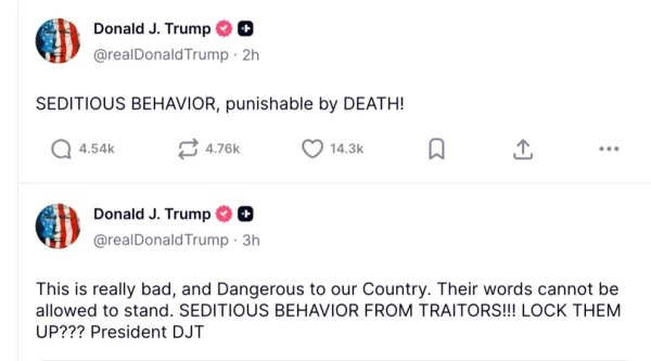 Η ένταση στην αμερικανική πολιτική σκηνή κλιμακώνεται μετά την παρέμβαση έξι Δημοκρατικών μελών του Κογκρέσου και τον Ντόναλντ Τραμπ να τους κατηγορεί για στασιαστές και να απειλεί ότι αυτό επιφέρει ποινή θανάτου.