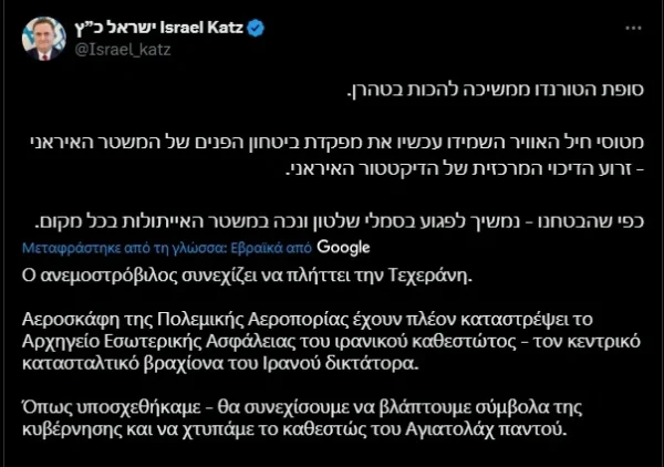 Νωρίτερα το χτύπημα σχολίασε και ο υπουργός Άμυνας του Ισραήλ Israel Katz σημειώνοντας σε αναρτησή του: Καταστρέψαμε το αρχηγείο εσωτερικής ασφάλειας του ιρανικού καθεστώτος, τον πυρήνα του κατασταλτικού μηχανισμού του δικτάτορα.