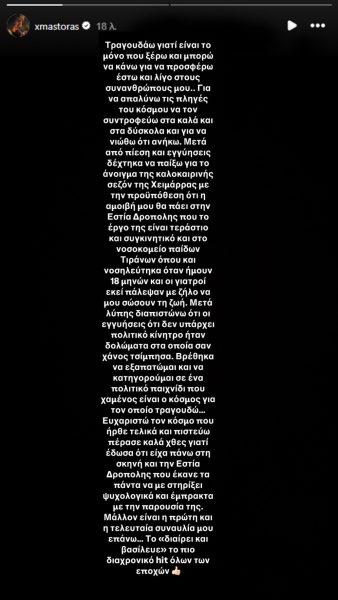 Μετά από πίεση και εγγυήσεις δέχτηκα να παίξω για το άνοιγμα της καλοκαιρινής σεζόν της Χειμάρρας με την προϋπόθεση ότι η αμοιβή μου θα πάει στην Εστία Δρόπολης που το έργο της είναι τεράστιο και συγκινητικό και στο νοσοκομείο Παίδων Τιράνων όπου και νοσηλεύτηκα όταν ήμουν 18 μηνών και οι γιατροί εκεί πάλεψαν με ζήλο να μου σώσουν τη ζωή.