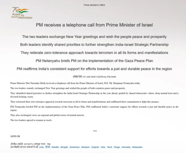 Από την πλευρά του, το γραφείο του Ινδού Πρωθυπουργού σημείωσε ότι ο Μόντι «επαναβεβαίωσε τη σταθερή υποστήριξη της Ινδίας στις προσπάθειες για μια δίκαιη και διαρκή ειρήνη στην περιοχή», τονίζοντας πως οι δύο χώρες πορεύονται με γνώμονα τις κοινές δημοκρατικές τους αξίες και την αμοιβαία εμπιστοσύνη.