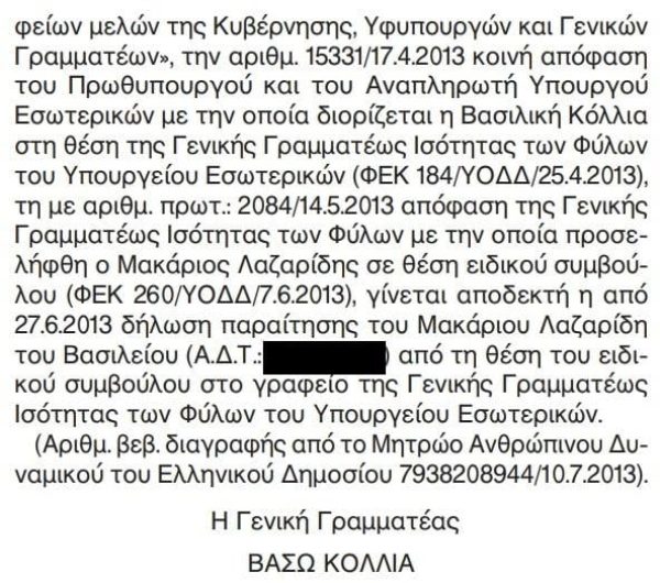Στις 26 Απριλίου 2013, ο Μακάριος Λαζαρίδης τοποθετήθηκε σε θέση ειδικού συμβούλου στο Γραφείο της Γενικής Γραμματέως Ισότητας των Φύλων (ΦΕΚ Υ.Ο.Δ.Δ. 260/2013). Δύο μήνες αργότερα, στις 27 Ιουνίου 2013, υπέβαλε την παραίτησή του από τη συγκεκριμένη θέση, όπως καταγράφεται στο ΦΕΚ Υ.Ο.Δ.Δ. 343/2013, προκειμένου να αναλάβει νέα θέση δημοσιογράφου στο Γραφείο Τύπου και Δημοσίων Σχέσεων του Υπουργείου Διοικητικής Μεταρρύθμισης και Ηλεκτρονικής Διακυβέρνησης (ΦΕΚ Υ.Ο.Δ.Δ. 380/2013).