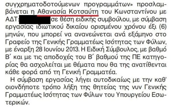 Όπως αναγράφεται στο ΦΕΚ Υ.Ο.Δ.Δ. 359/2013, η κ. Κοτσαύτη «προσλαμβάνεται σε θέση ειδικής συμβούλου, με σύμβαση εργασίας ιδιωτικού δικαίου ορισμένου χρόνου διάρκειας έξι (6) μηνών, με δυνατότητα ανανέωσης ανά εξάμηνο, στο Γραφείο της Γενικής Γραμματέως Ισότητας των Φύλων, με έναρξη 28 Ιουνίου 2013».