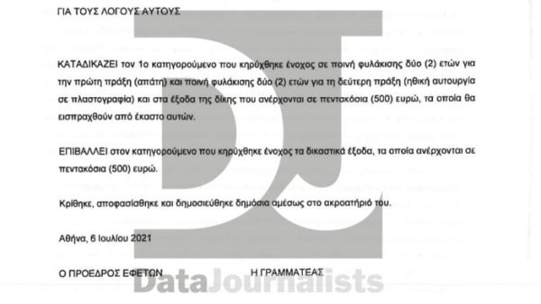 Τα αδικήματα αυτά είχαν τελεστεί την περίοδο 2004–2007, όταν, σύμφωνα με τη δικογραφία, είχαν «εξαφανιστεί» περίπου 220.000 ευρώ. Το δικαστήριο του επέβαλε ποινή δύο ετών για απάτη, δύο ετών για ηθική αυτουργία, και 500 ευρώ δικαστικά έξοδα, με τη συνολική ποινή να καθορίζεται στα τρία χρόνια φυλάκιση με αναστολή.