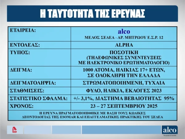 Η νέα δημοσκόπηση της ALCO, που παρουσιάστηκε στο δελτίο ειδήσεων του Alpha, δείχνει προβάδισμα 12,5 ποσοστιαίων μονάδων για τη Νέα Δημοκρατία στην πρόθεση ψήφου επί των εγκύρων. Στη δεύτερη θέση βρίσκεται το ΠΑΣΟΚ, καταγράφοντας άνοδο 0,8 μονάδων σε σύγκριση με τον Ιούνιο. Τη μεγαλύτερη ενίσχυση εμφανίζει η Ελληνική Λύση, με άνοδο 1,4 μονάδων, εξασφαλίζοντας την τρίτη θέση, ενώ η Πλεύση Ελευθερίας σημειώνει απώλειες 2,4 μονάδων. Θετική μεταβολή καταγράφουν επίσης ο ΣΥΡΙΖΑ και η Φωνή Λογικής.