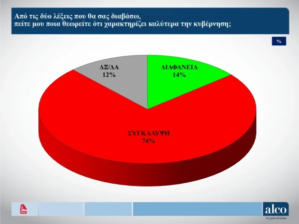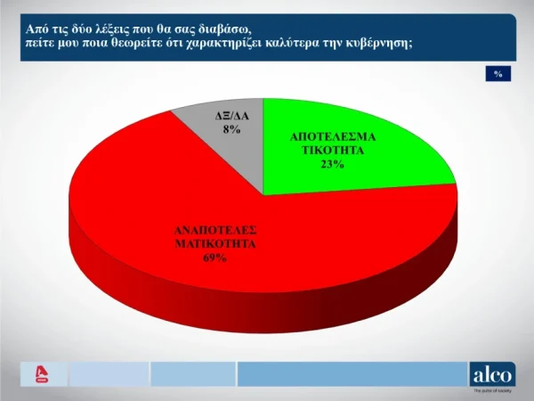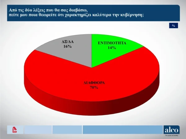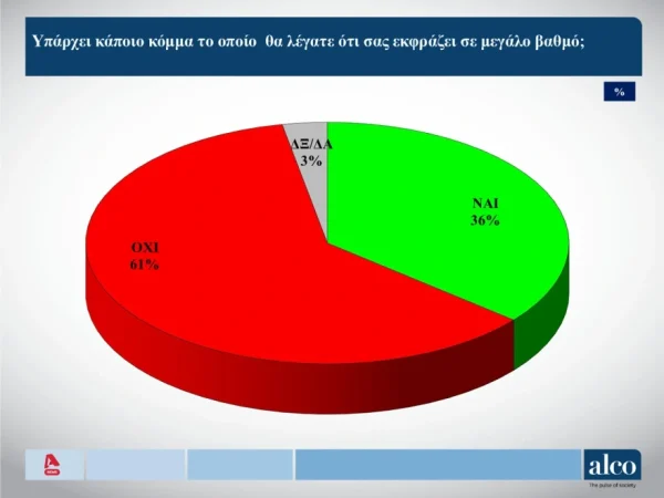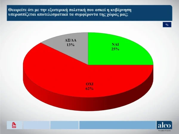 Τελικά υπάρχει πολιτικός χώρος για ένα νέο πολιτικό κόμμα υπό τον Αντώνη Σαμαρά. Αυτό προκύπτει από τη νέα δημοσκόπηση της ALCO, που έγινε για την τηλεόραση του ALPHA. Και συνδέεται άμεσα με δύο συμπεράσματα της δημοσκόπησης αυτής: Το πρώτο είναι ότι το 62% των ερωτηθέντων δεν φαίνεται να είναι καθόλου ικανοποιημένο από τους χειρισμούς της Κυβέρνησης στην εξωτερική πολιτική, γιατί θεωρεί ότι δεν υπηρετούν οι χειρισμοί αυτοί το Εθνικό συμφέρον.