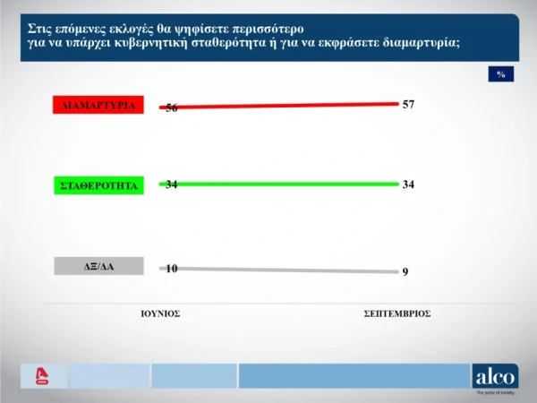 Η ΝΔ εμφανίζει απώλεια μίας μονάδας, με το ποσοστό όσων δηλώνουν ότι ψηφίζουν για «κυβερνητική σταθερότητα» να μένει αμετάβλητο στο 34%. Το 36% θεωρεί ότι κάποιο κόμμα τον εκφράζει σε μεγάλο βαθμό, ενώ το 61% δηλώνει το αντίθετο. Παρά ταύτα, η ΝΔ φαίνεται να διαθέτει το μεγαλύτερο περιθώριο διεύρυνσης, καθώς το 50% των αναποφάσιστων (που φτάνουν το 19% του εκλογικού σώματος) αυτοπροσδιορίζονται ως Κεντροδεξιοί ή Κεντρώοι. Αντίθετα, μόλις το 21% δηλώνει Κεντροαριστερός ή Αριστερός.