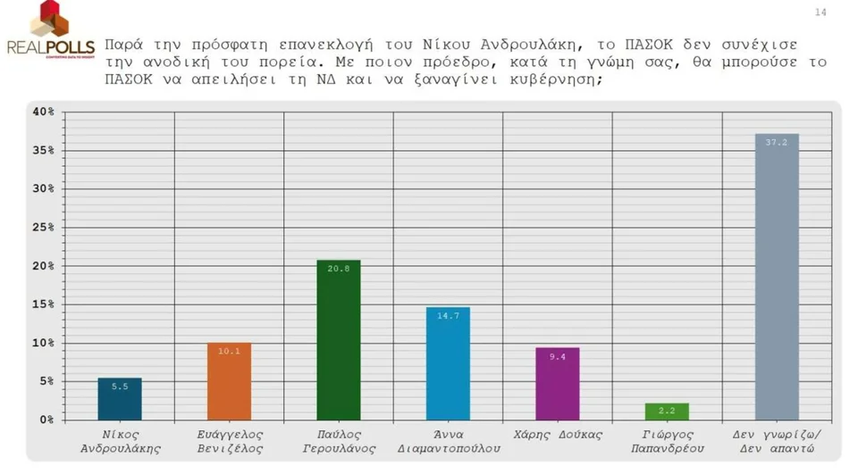 Στο ερώτημα με ποιον πρόεδρο το ΠΑΣΟΚ θα μπορούσε να απειλήσει τη ΝΔ και να ξαναγίνει κυβέρνηση, οι απαντήσεις είναι: