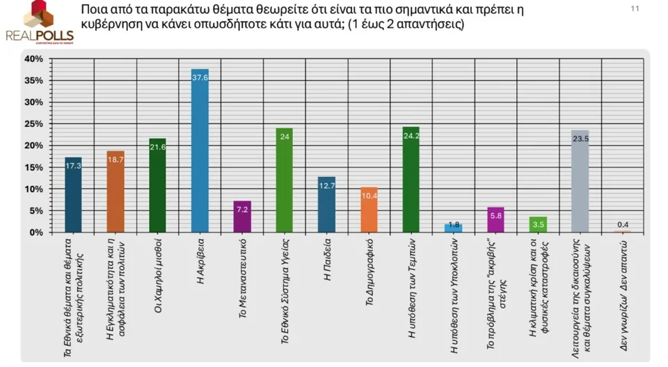 Μετά την ακρίβεια (37,6%), η υπόθεση της σιδηροδρομικής τραγωδίας της 28ης Φεβρουαρίου 2023 έρχεται σε δεύτερη θέση (24,2%), ενώ έπεται το σύστημα υγείας (24%). Οι χαμηλοί μισθοί είναι τέταρτο πρόβλημα, η εγκληματικότητα πέμπτο και τα εθνικά θέματα έκτο.