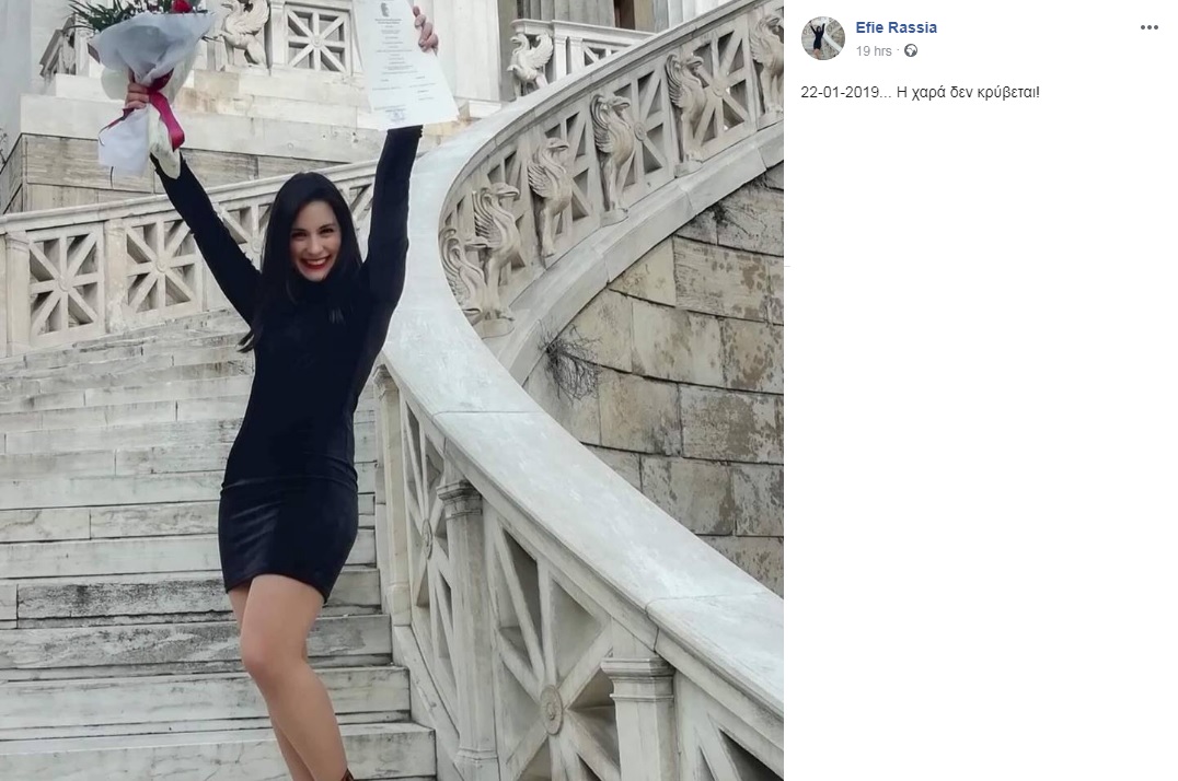 Η ίδια, φανερά ενθουσιασμένη, αποκάλυψε τα χαρμόσυνα νέα μέσα από τον προσωπικό της λογαριασμό στο Facebook, όπου δημοσίευσε μια φωτογραφία από την ορκωμοσία της. Κρατώντας ψηλά το χαρτί του πτυχίου και μια ανθοδέσμη, πόζαρε χαμογελαστή στον φακό, φορώντας ένα μίνι μαύρο φόρεμα που αποκάλυπτε το καλλίγραμμο κορμί της.