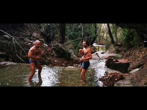 Ακολουθεί η κρυογένεση: Θανάσης και Αλέξανδρος σε στάση πολεμιστή κάνουν ασκήσεις ώστε να ενεργοποιηθεί η σπονδυλική τους στήλη και η επαφή με το παγωμένο νερό στο ρέμα του Βαρνάβα να γίνει μια στιγμή απόλαυσης.