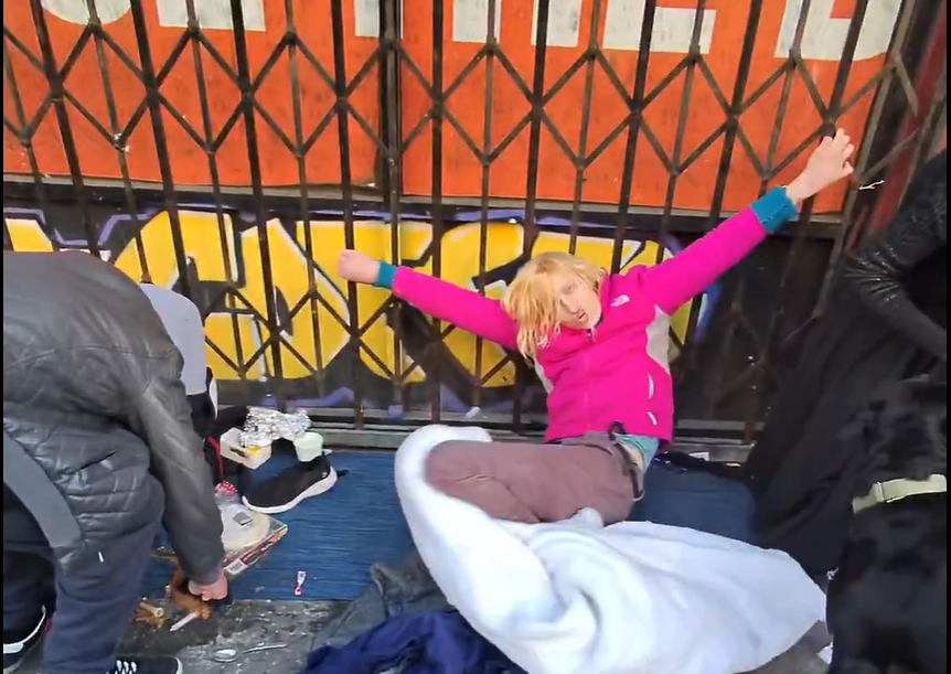 This is San Francisco. Where people can camp out on any corner any sidewalk in any business doorway this woman just shoot up 100 cc of fentanyl mixed with speed and this is the side effects pic.twitter.com/c7w0gvJueO