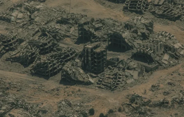 Από ψηλά, η Γάζα μοιάζει με τα ερείπια αρχαίου πολιτισμού, αποκαλυμμένα μετά από αιώνες σιωπής. Ένα μωσαϊκό από σπασμένα τοιχώματα, τσιμεντένιες μάζες, κρατήρες, χαλάσματα και δρόμους που δεν οδηγούν πουθενά. Τα απομεινάρια από πόλη που έχει σβηστεί από τον χάρτη.