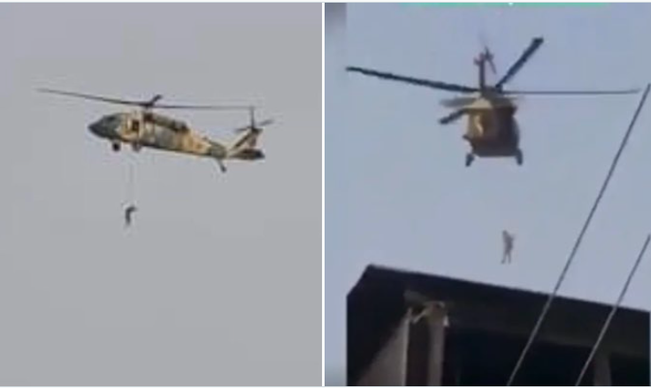 Video shows Taliban fly one of the captured UH-60A Black Hawk Helicopters with what looks like someone hanging from a rope underneath.#Kandahar | #Afghanistanpic.twitter.com/6oIRemjvSS