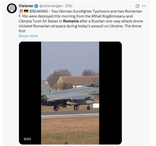 Η Ρουμανία απογείωσε δύο Eurofighters -της γερμανικής αποστολής αστυνόμευσης των αιθέρων στη Ρουμανία- και αργότερα δύο ρουμανικά μαχητικά F-16 και προειδοποίησε τους πολίτες στις νοτιοανατολικές κομητείες Τούλτσεα και Γαλάτσι να καλυφθούν, δήλωσε το υπουργείο. Το υπουργείο πρόσθεσε ότι δεν έχει πληροφορίες για πτώση μη επανδρωμένων αεροσκαφών σε ρουμανικό έδαφος.