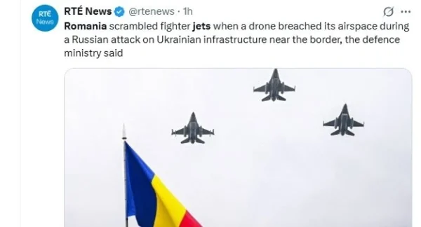 Η Ρουμανία απογείωσε σήμερα μαχητικά αεριωθούμενα, όταν ένα μη επανδρωμένο εναέριο όχημα παραβίασε τον εθνικό εναέριο χώρο της στη διάρκεια ρωσικής επίθεσης σε ουκρανική υποδομή κοντά στα σύνορα, ανακοίνωσε το υπουργείο Άμυνας. Η εν λόγω χώρα μέλος της Ευρωπαϊκής Ένωσης και του ΝΑΤΟ, η οποία έχει σύνορα μήκους 650 χιλιομέτρων με την Ουκρανία, είχε καταγράψει επανειλημμένα συντρίμμια από ρωσικά μη επανδρωμένα αεροσκάφη στο έδαφός της, καθώς η Μόσχα επιτίθεται σε ουκρανικές λιμενικές υποδομές στην απέναντι όχθη του Δούναβη.