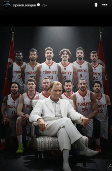 Αρχικά, ο Σενγκούν δημοσίευσε μια φωτογραφία δημιουργημένη με τη βοήθεια τεχνητής νοημοσύνης, όπου εμφανίζεται ο Κεμάλ Ατατούρκ καθισμένος σε μια καρέκλα, ενώ πίσω του στέκονται όλοι οι παίκτες της τουρκικής εθνικής ομάδας μπάσκετ, δημιουργώντας έτσι μια ισχυρή συμβολική εικόνα.