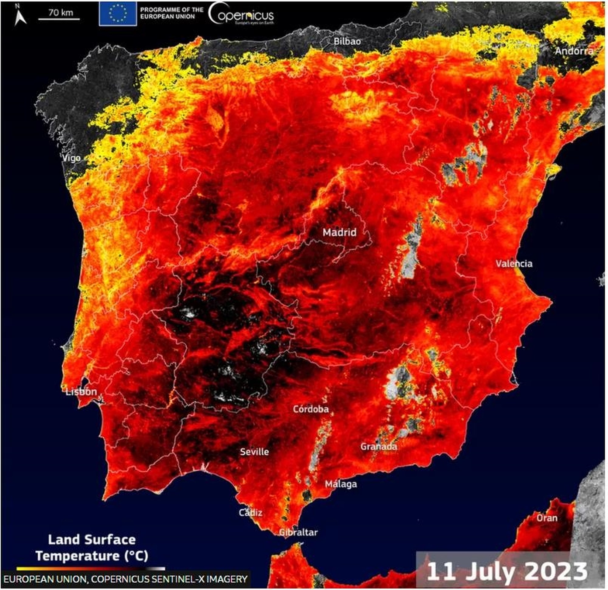 Δορυφορική εικόνα που καταγράφηκε από την αποστολή Copernicus Sentinel της ΕΕ αποκάλυψε ότι η θερμοκρασία στην επιφάνεια της γης στην περιοχή της Εξτρεμαδούρα είχε φτάσει τους 60 βαθμούς Κελσίου την Τρίτη.