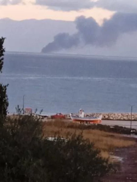 Φωτογραφία που τραβήχτηκε από την Κέρκυρα δείχνει καθαρά το πλοίο και πυκνούς καπνούς να βγαίνουν.