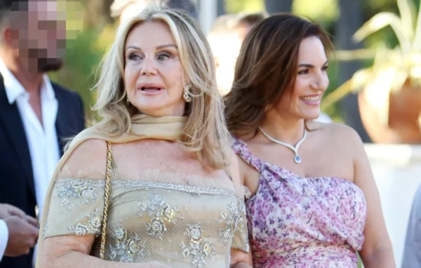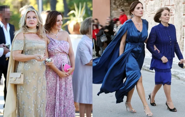 Η σύζυγος του επιχειρηματία Δημήτρη Θεοδωρίδη, Δούκισσα Νομικού επέλεξε ένα χρυσό κόσμημα «λαιμαριά» ντυμένο με πολύτιμες πέτρες, ενώ η μητέρα του γαμπρού, Αγάπη Πολίτη αρκέστηκε σε δυο υπερμεγέθεις κρίκους από κίτρινο χρυσό με καφέ διαμάντια.