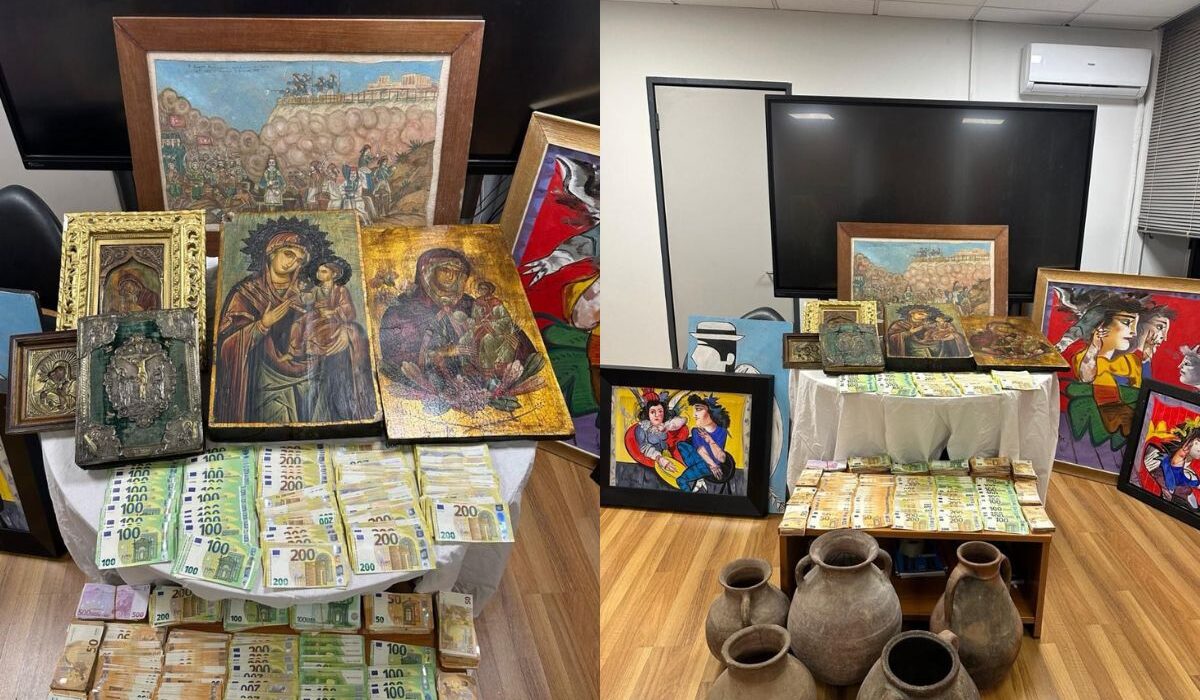 Κατά τη διάρκεια των ερευνών, κατασχέθηκαν συνολικά 190.000 ευρώ σε μετρητά, καθώς και πλήθος αρχαίων αντικειμένων, όπως αμφορείς, βυζαντινές εικόνες και πάνω από 300 πίνακες ζωγραφικής.