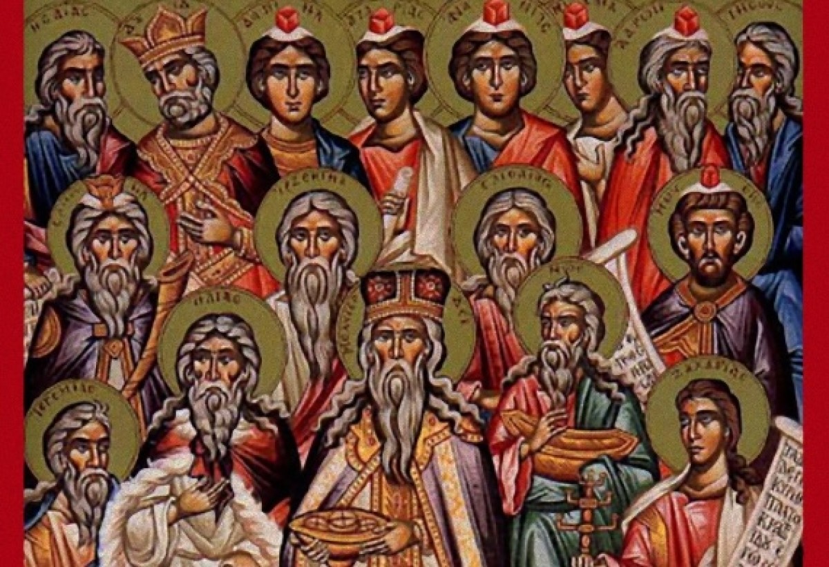 Ὑμνήσωμεν πιστοί, τοὺς Προπάτορας πάντας, Χριστοῦ τοῦ δι’ ἡμᾶς, ἐπὶ γῆς ὁραθέντος, δοξάζοντες ἐν ᾄσμασι, τὸν αὐτοὺς θαυμαστώσαντα, ὡς τὴν ἔλευσιν, προεκτυπώσαντας τούτου, καὶ τὴν γέννησιν, τὴν ἐκ Παρθένου ἀφράστως, τῷ κόσμῳ κηρύξαντας.