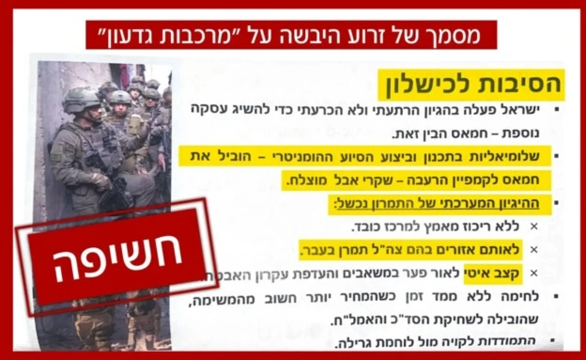 Ένα εσωτερικό έγγραφο του IDF που διέρρευσε διαψεύδει τον Αρχηγό του Επιτελείου του IDF Αντιστράτηγο Eyal Zamir, ο οποίος περιέγραψε ως επιτυχή την επιχείρηση «Τα άρματα του Γεδεών».