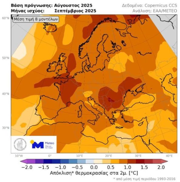 Επίσης αναφέρει, πως «συνολικά για την ευρωπαϊκή ήπειρο, ο χάρτης απεικονίζει την απόκλιση της μέσης θερμοκρασίας Σεπτεμβρίου με βάση την μέση τιμή των 400 σεναρίων. Όπως προκύπτει, θετικές αποκλίσεις αναμένονται σε όλη την ήπειρο, με τις μεγαλύτερες τιμές να εντοπίζονται στην Γαλλία και τα Βαλκάνια όπου ξεπερνούν τον +1°C.»