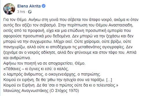 «Για τον Θέμο. Ανήκω στη γενιά που σέβεται τον άταφο νεκρό, ακόμα κι όταν αυτός δεν αξίζει τον σεβασμό. Στην περίπτωση του Θέμου Αναστασιαδη, εκτός από τα προφανή, είχα και μια επώδυνη προσωπική εμπειρία που αφορούσε προσωπικά μου δεδομένα. Δεν μπορώ να την ξεχάσω και δεν μπορώ να την συγχωρέσω. Μέχρι εκεί. Ούτε χαίρομαι, ούτε βρίζω, ούτε πανηγυρίζω, αλλά ούτε κι αποδέχομαι τις μεταθανάτιες αγιογραφίες. Δεν ξεχνάμε αν ο νεκρός αδίκησε, αλλά δεν φτύνουμε και στον τάφο του. Απλά και ανθρώπινα.