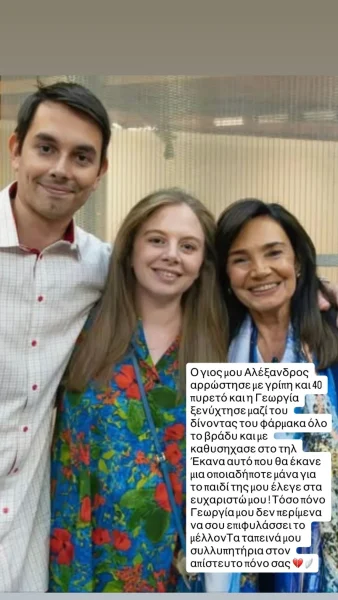 Ο γιος μου Αλέξανδρος αρρώστησε με γρίπη και 40 πυρετό και η Γεωργία ξενύχτησε μαζί του δίνοντάς του φάρμακα όλο το βράδυ και με καθησύχασε στο τηλέφωνο. Έκανα αυτό που θα έκανε μια οποιαδήποτε μάνα για το παιδί της, μου έλεγε “στα ευχαριστώ μου”! Τόσο πόνο, Γεωργία μου, δεν περίμενα να σου επιφυλάσσει το μέλλον. Τα ταπεινά μου συλλυπητήρια στον απίστευτο πόνο σας».