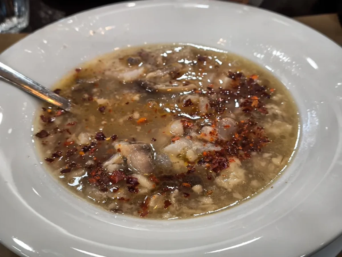 Μέσα στην κουζίνα του εστιατορίου, η παρασκευή της σούπας είναι σχεδόν τελετουργική, καθώς ο σεφ Πανταζής Κουκουμβρής χειρίζεται το μαχαίρι του μπροστά σε βραστά καζάνια όπου τα πόδια και οι κοιλιές σιγοβράζουν στο ζωμό τους.